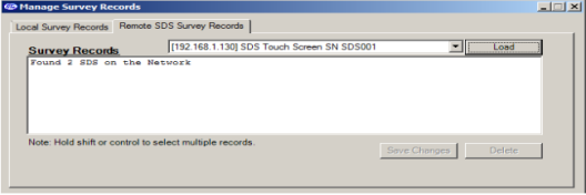 Note: Currently, the drop-down list will also be populated with Video Recorder data loggers.  Please use caution when selecting a data logger from the list; deleting data from a Video Recorder could produce undesirable consequences.  When the operator has selected the correct data logger, he/she can click on the “Load” button to load the survey data.  To select multiple sequential records, hold down the Shift key and click on the desired records.  To select multiple non-sequential records, hold down the Ctrl key and click on the desired records.  Clicking on the “Delete” button will remove the survey records from the list.  Note – The survey records will be removed from the list, but not actually deleted from the SDS data logger until the “Save Changes” button has been clicked.  If one or more survey record is accidentally deleted, click on the “X” in the top right of the screen to close the screen down, and start over.  Clicking on the “Save Changes” button will save the changes back to the SDS data logger.  No confirmation is needed for this action.  Once the changes have been saved, a message box will be displayed (Figure 94 - Changes Saved message box).