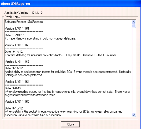The About menu option displays the SDS Reporter version that is running, and all of the previous versions with any version notes (Figure 105 - SDSReporter About box).