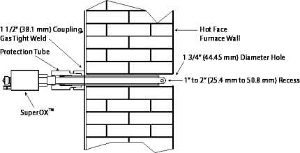 For new installations in furnaces, an entry fitting must be provided at the furnace wall to permit the sensor to extend into the furnace chamber. The furnace is prepared by drilling (ideally) a 3” (76.2 mm) diameter hole through the wall and the insulation. A 1" (25.4 mm) coupling may then be welded to the wall to provide the gas-tight entry. As the SuperOXTM has a 1" (25.4 mm) NPT hub; use of conventional 1" (25.4 mm) fittings allows for appropriate installation. A combination of 1" (25.4 mm) nipples and couplings allows for appropriate insertion depth.
